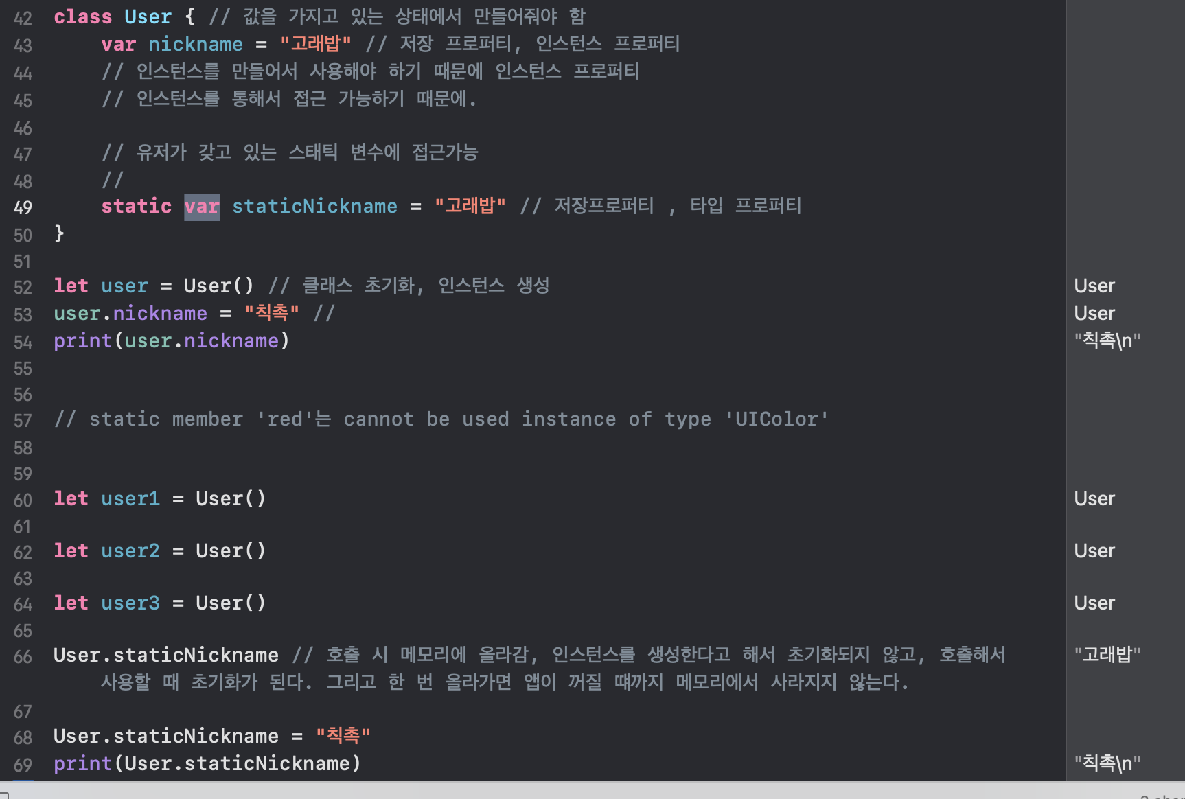 그렇기 때문에 타입 프로퍼티는 무조건 클래스에서 생성과 동시에 초기화를 해줘야만 한다.